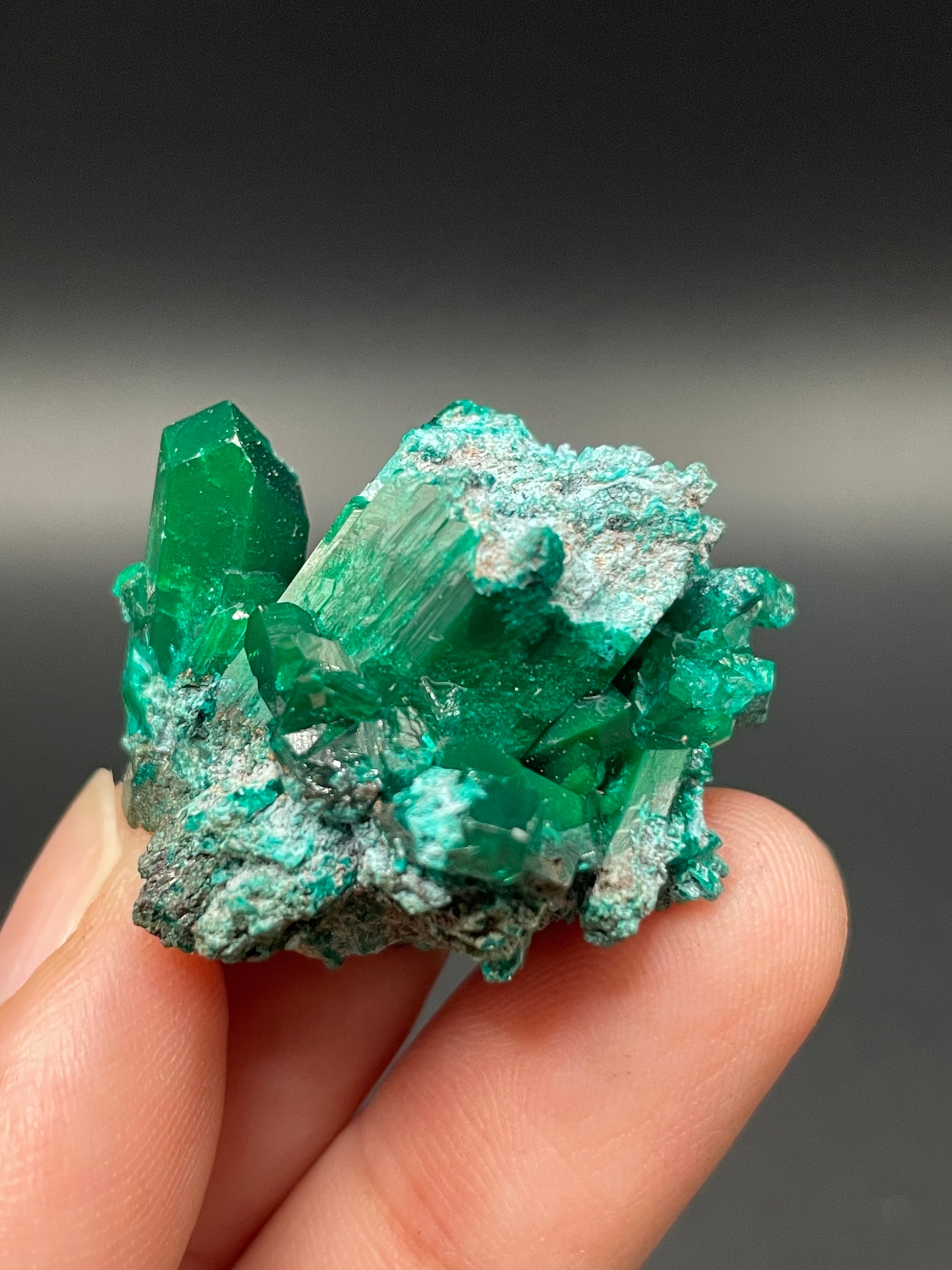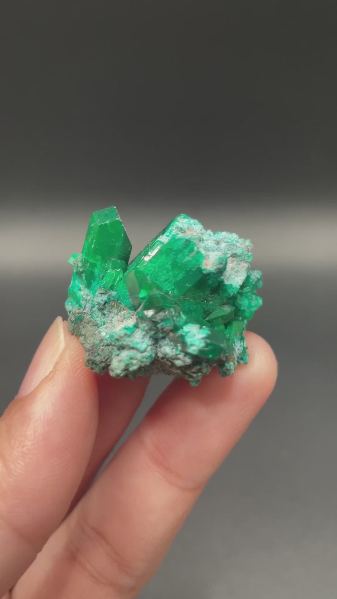 Dioptase is a striking green crystal known for its intense color and glassy luster, often forming in small, prismatic crystals or as druzy aggregates. It is valued for its healing properties, especially in matters related to emotional healing, heart-centered consciousness, and promoting self-love and compassion.