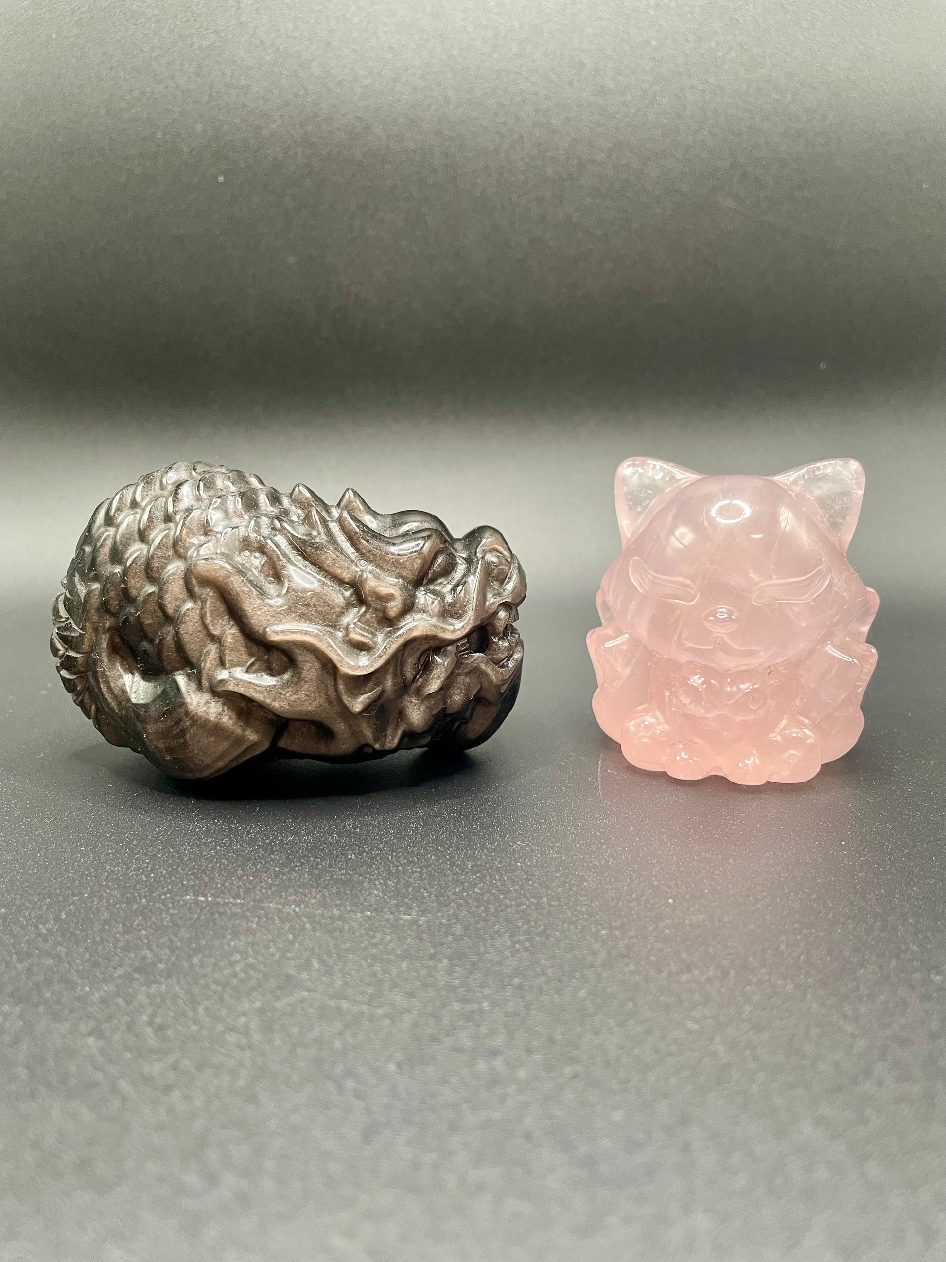 Unleash the power of love and protection with this enchanting Rose Quartz Nine-Tailed Fox and Obsidian Dragon bundle. The Rose Quartz Fox radiates love, attraction, and emotional healing, while the Obsidian Dragon offers strength, grounding, and powerful protection against negative energies. Together, they make a captivating duo, perfect for inviting harmony and safeguarding your space.